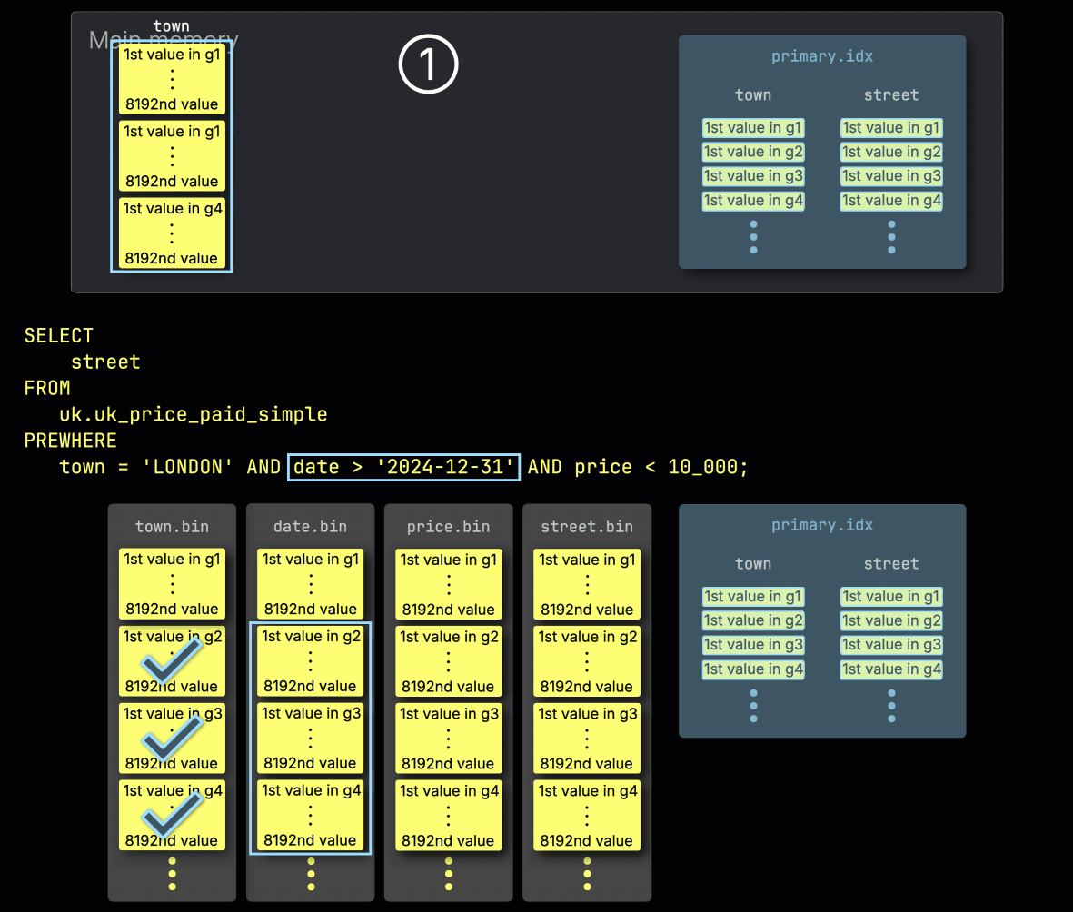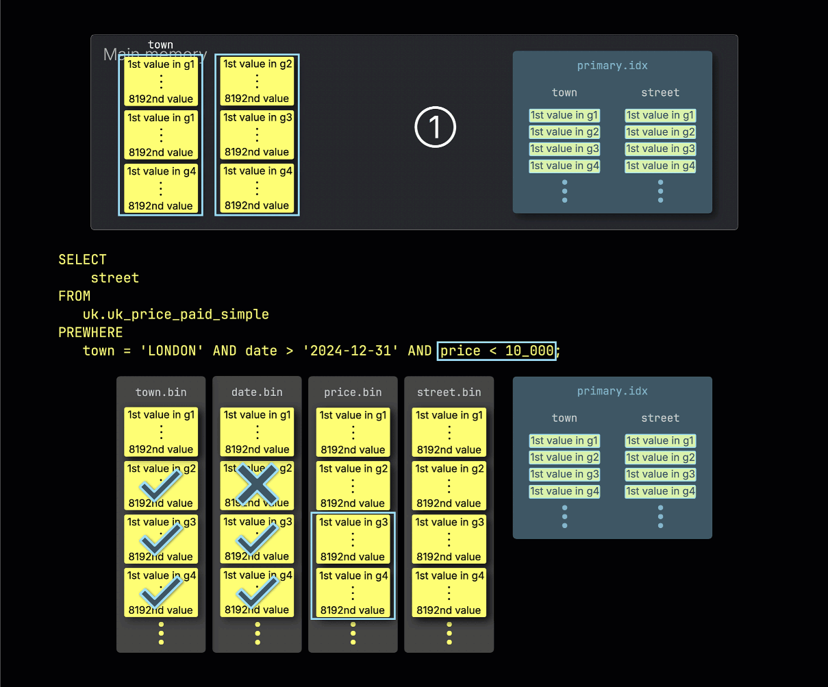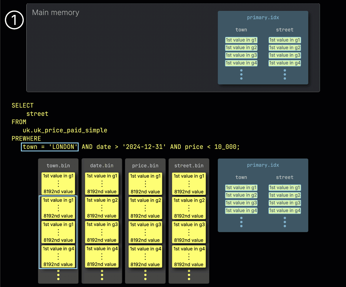 ClickHouse begins PREWHERE processing by ① reading the selected granules from the town column and checking which ones actually contain rows matching London.